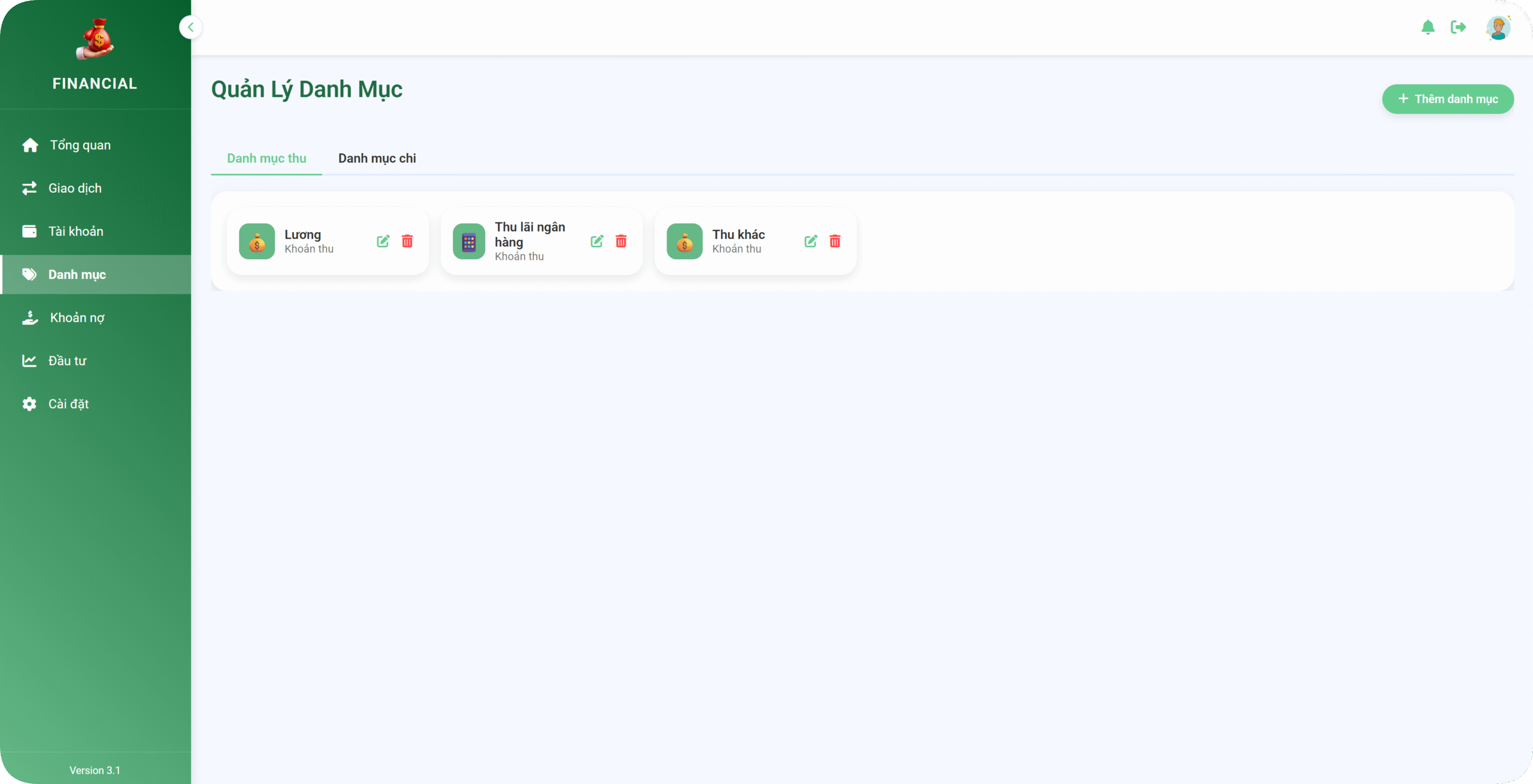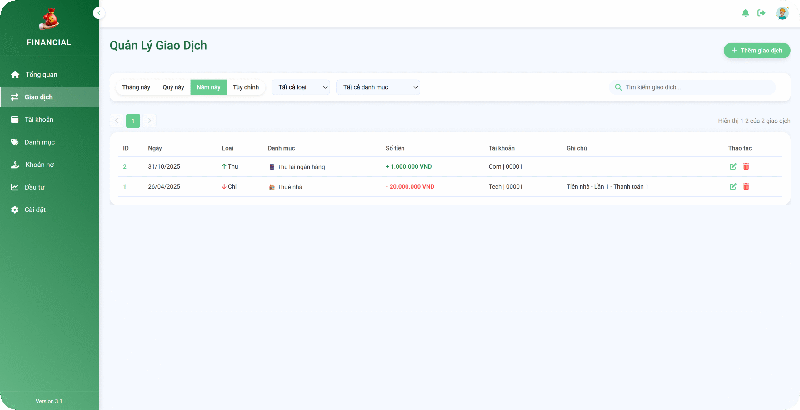 - 💸 Giao dịch thu – chi: lọc theo thời gian, danh mục, tài khoản.