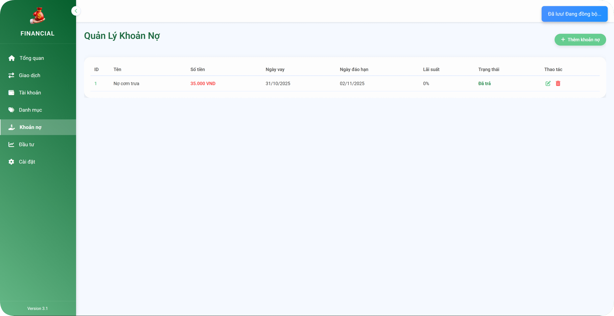 - 🧾 Quản lý nợ & đầu tư: theo dõi trạng thái, lợi nhuận, hạn trả.
