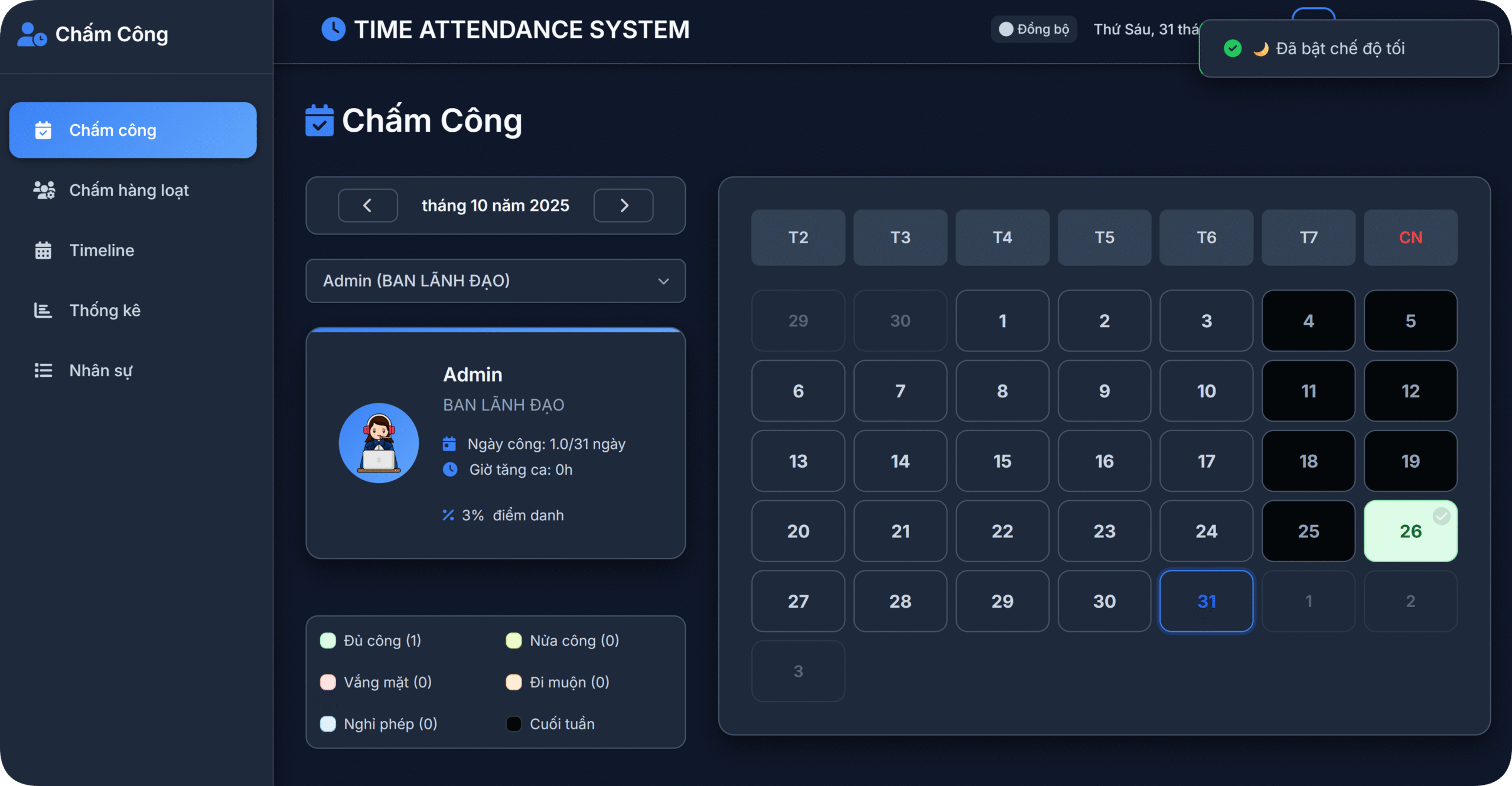 🕓 Chấm công thông minh: Giao diện lịch rõ ràng, màu sắc trực quan theo trạng thái làm việc.