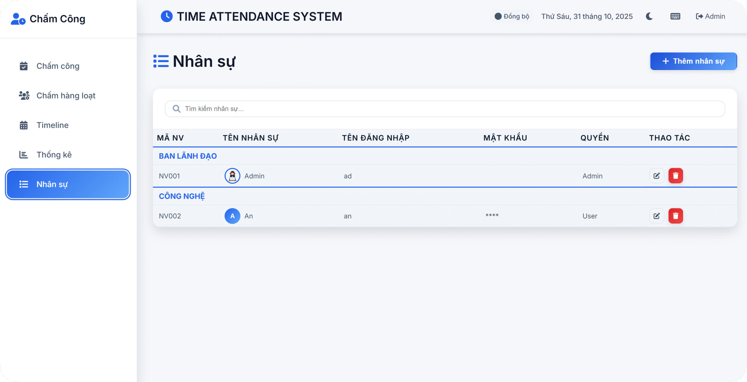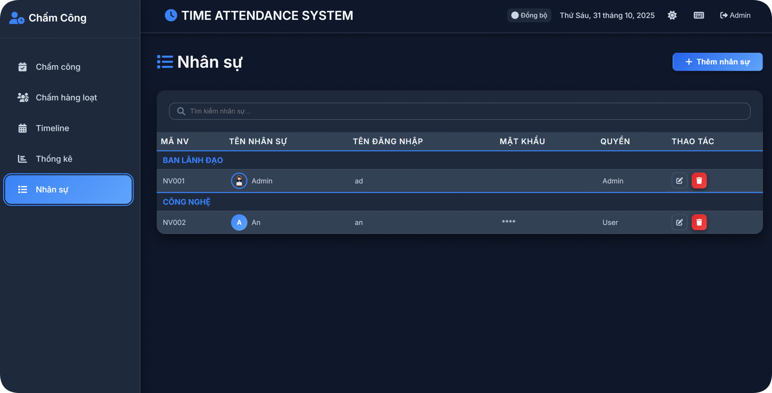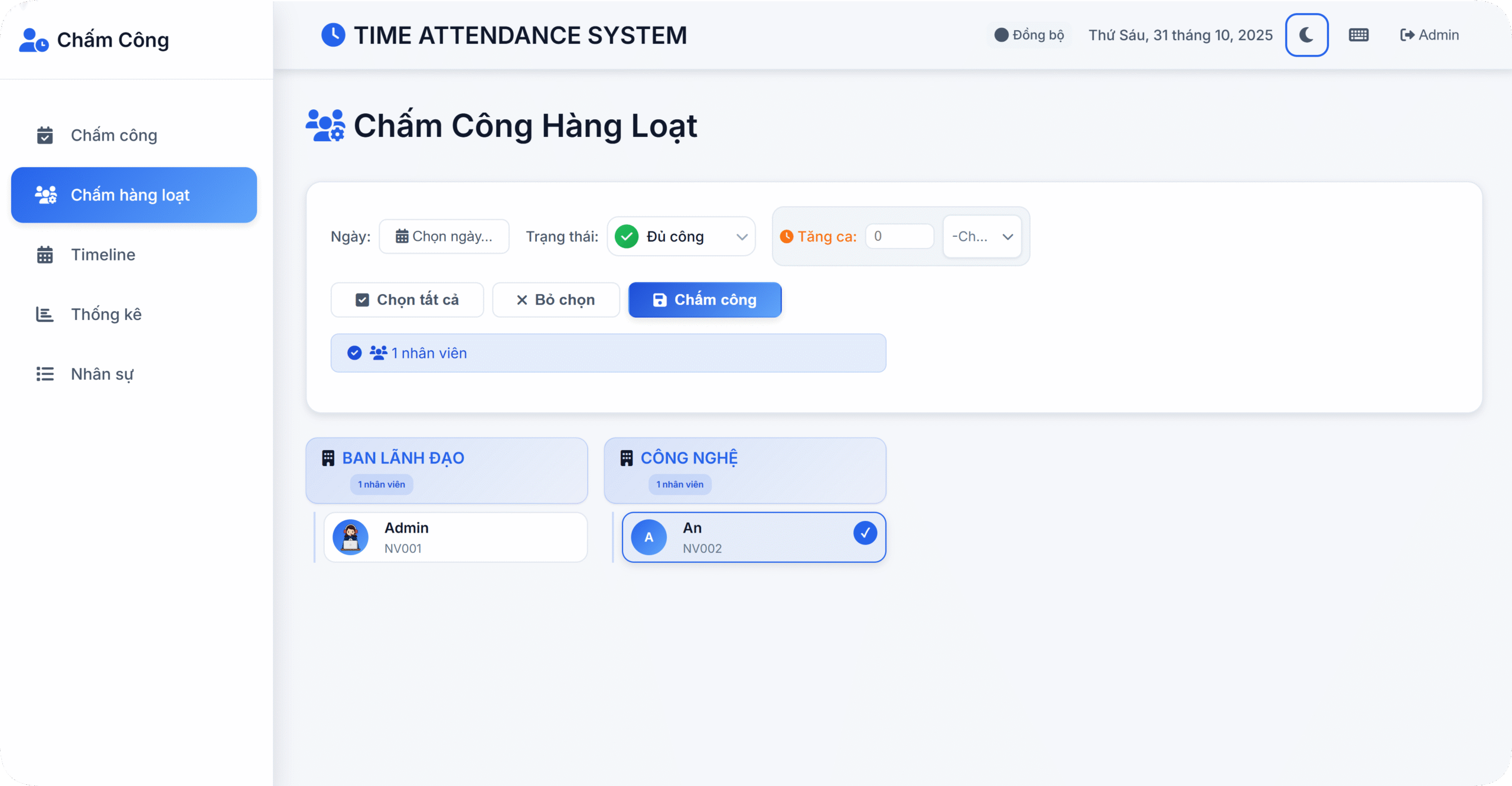 ⚙️ Chấm công hàng loạt: Cập nhật trạng thái cho nhiều nhân viên cùng lúc, tiết kiệm tối đa thời gian.