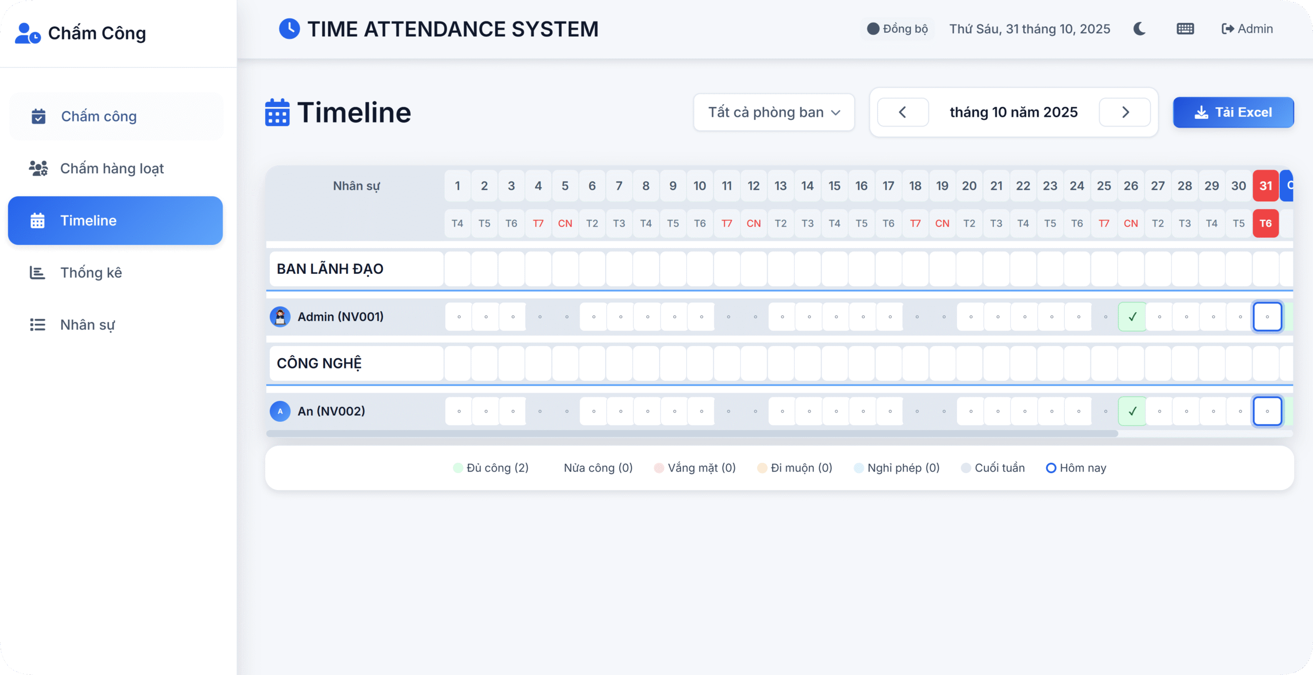 🗓️ Timeline chi tiết: Hiển thị toàn bộ tháng, đánh dấu ngày làm – nghỉ – cuối tuần – hôm nay.