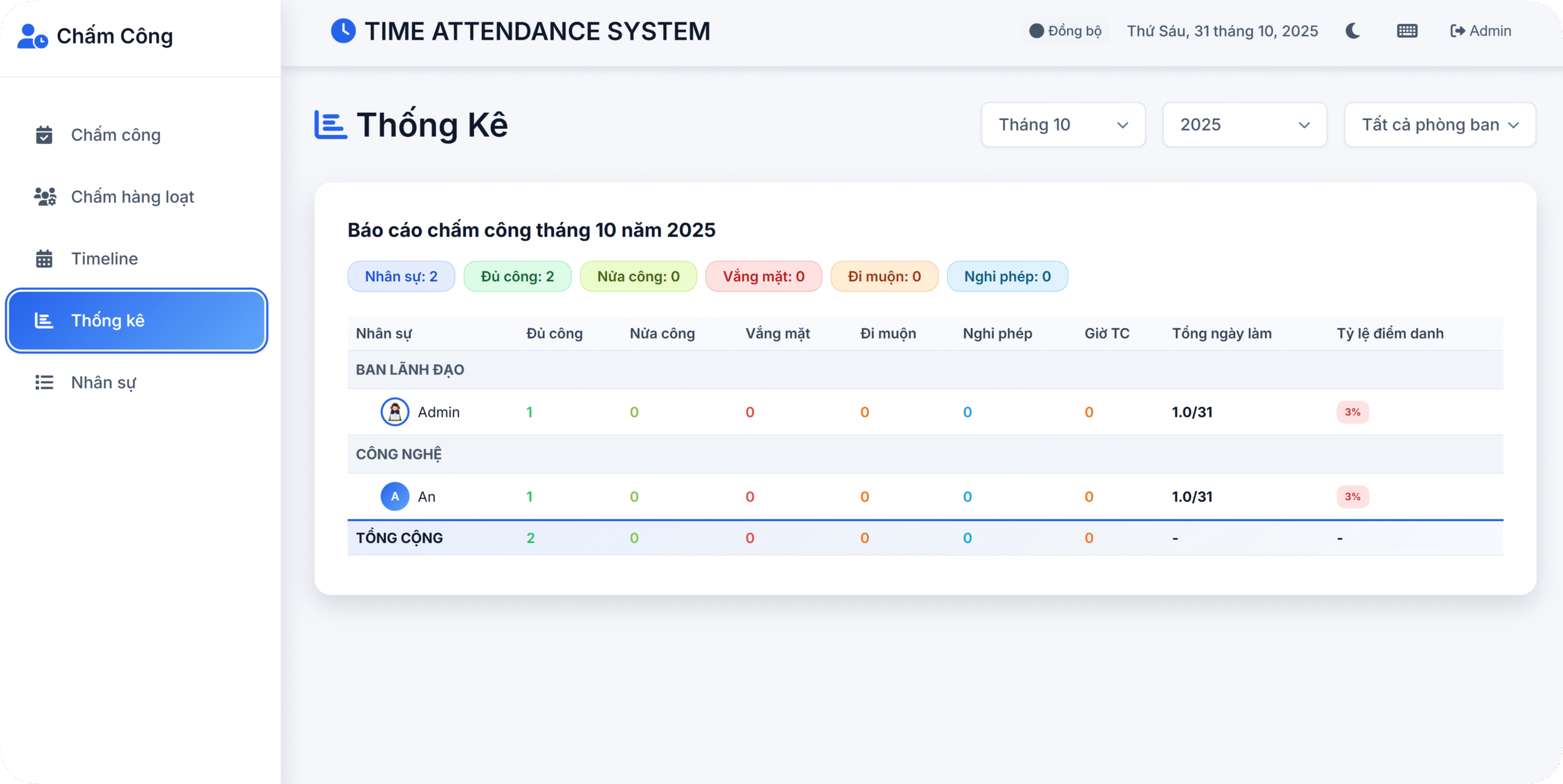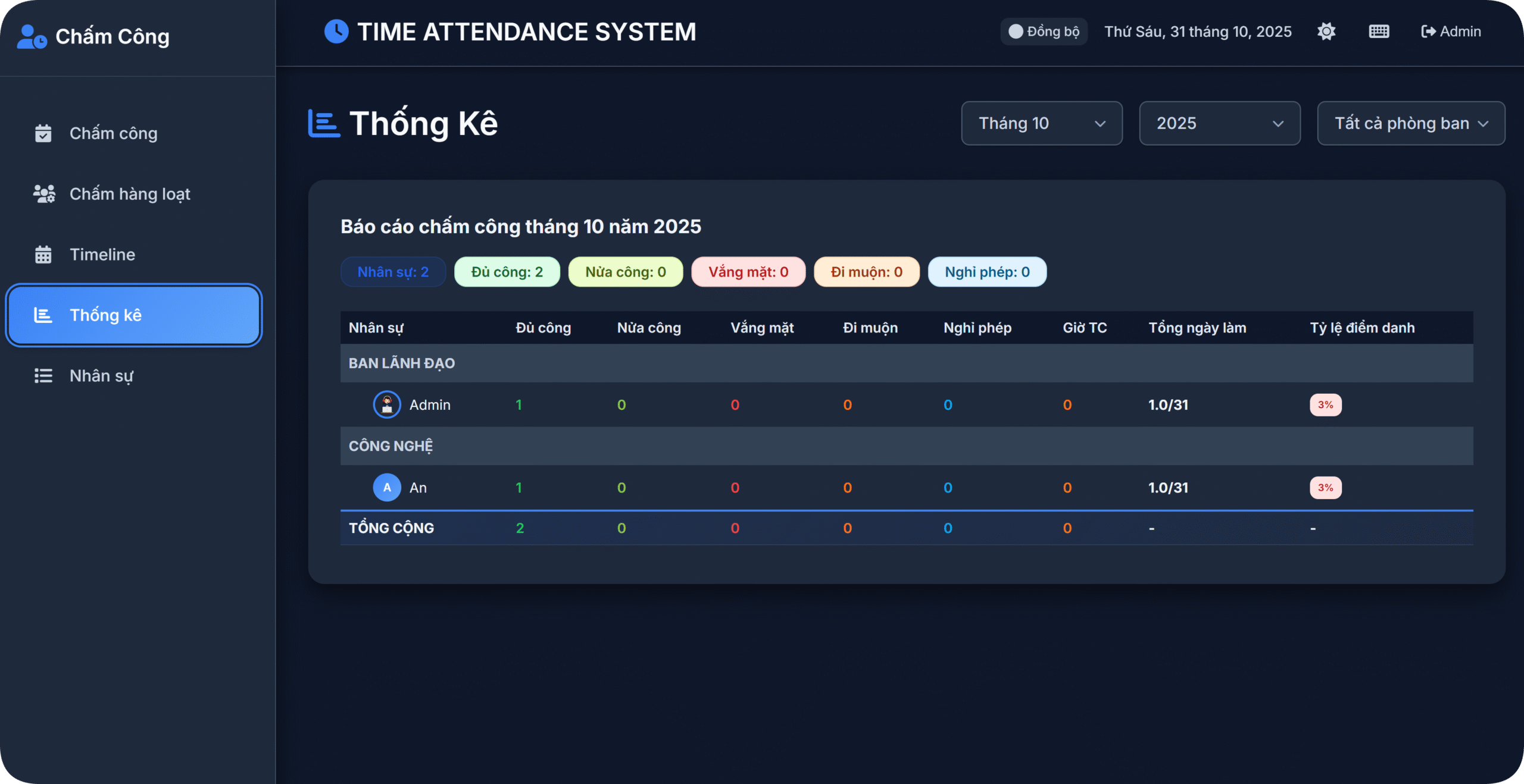 📈 Thống kê tự động: Báo cáo chấm công theo tháng/phòng ban, tổng hợp công, nghỉ, đi muộn, nghỉ phép.