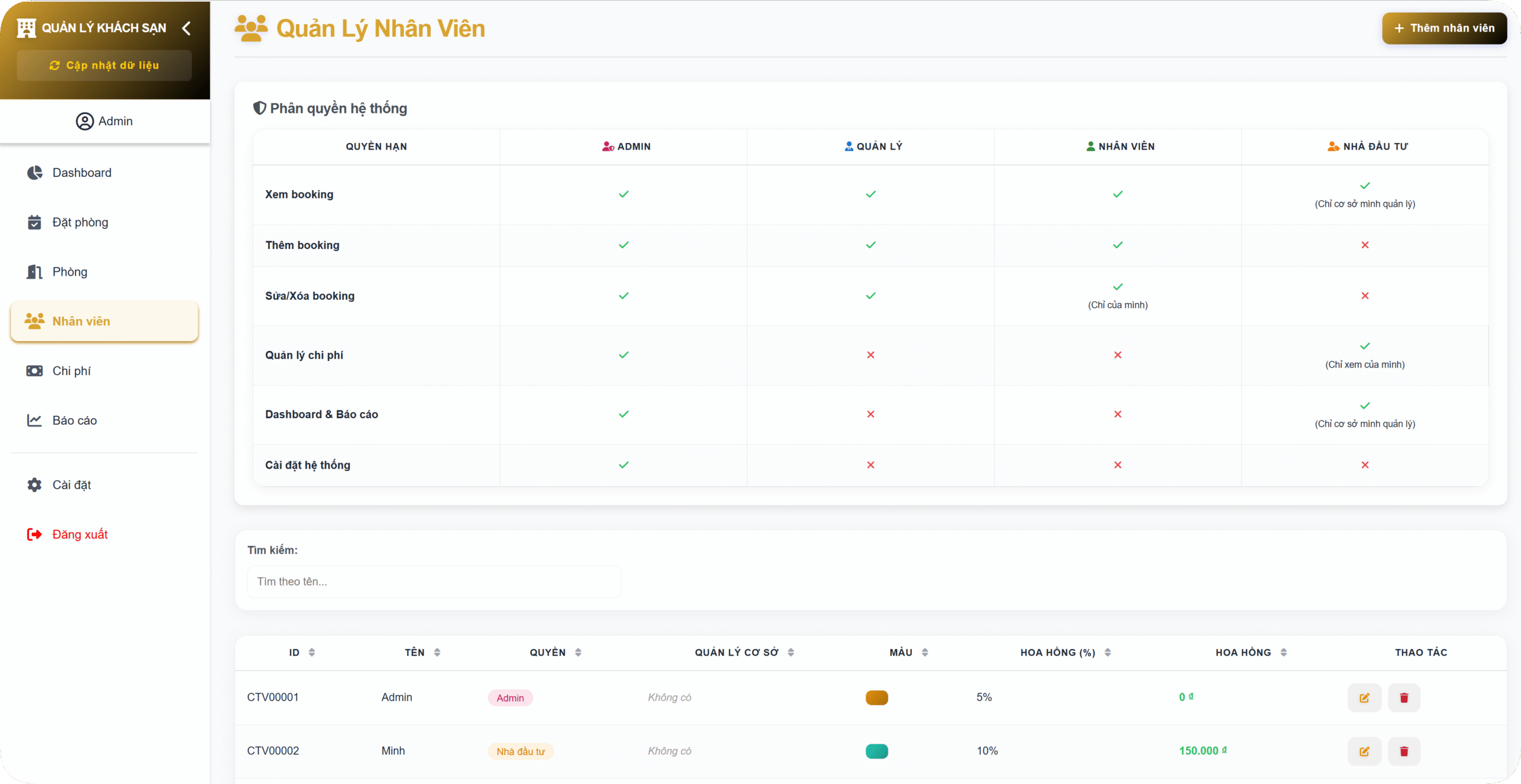 Đăng nhập & phân quyền 4 cấp: Admin / Quản lý / Nhân viên / Nhà đầu tư. Phiên đăng nhập 2 giờ an toàn.